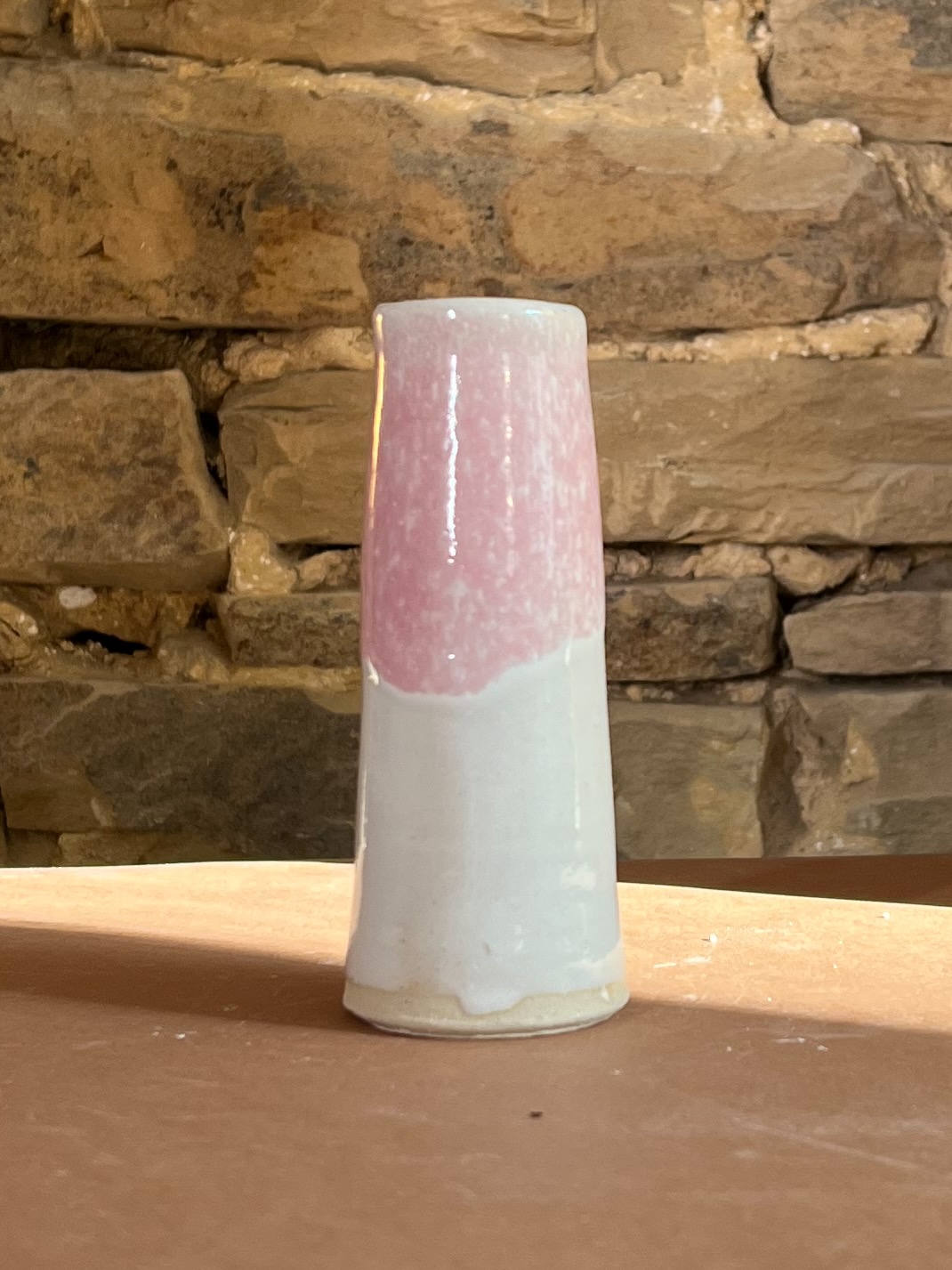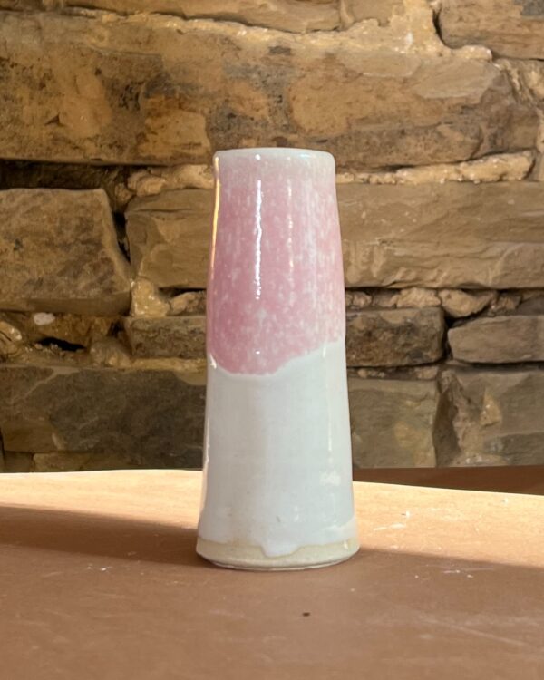 Un petit vase rose et blanc style bouteille de philtre d’amour bien sur. Une fleur graphique est gravée sur le pied pour rappeler la douceur de l’été.