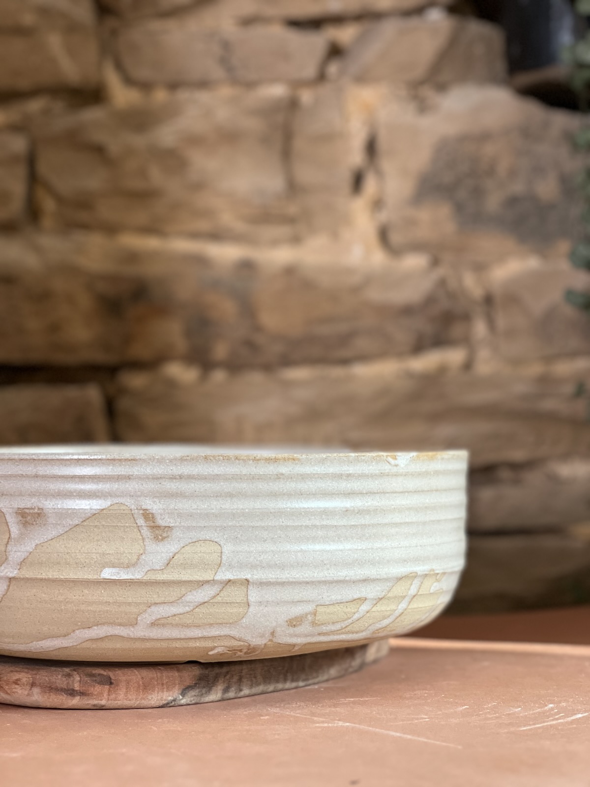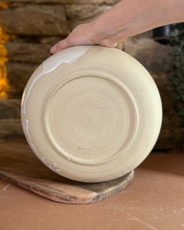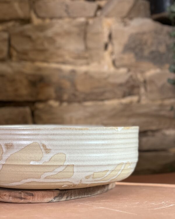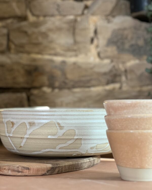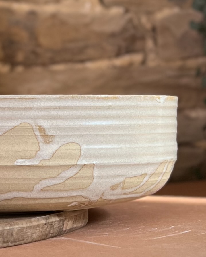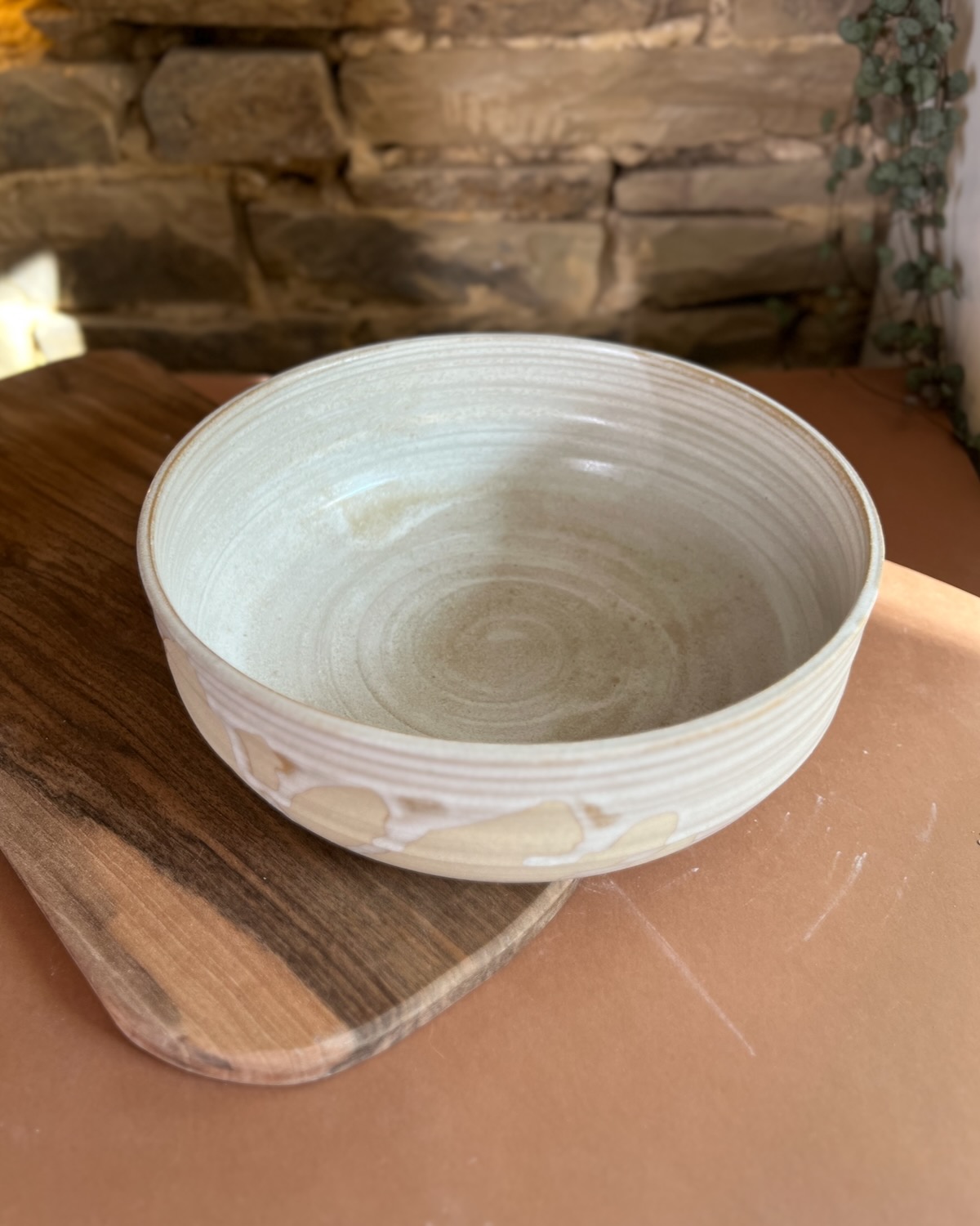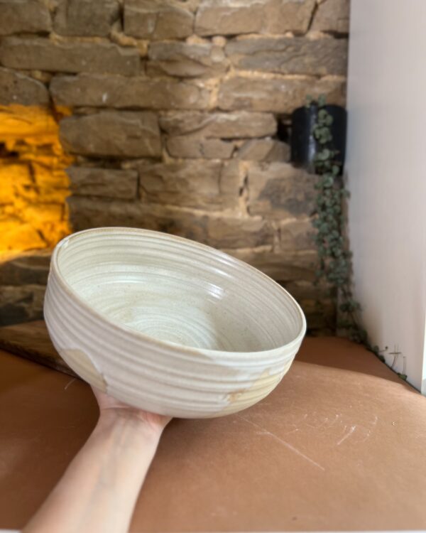 Un saladier beige en grés, très large et généreux avec tout ce que j’aime… Je l’ai baptisé “vague généreuse”. Une couleur douce, satinée et spontanée. Une forme qui met à l’honneur la trace du travail. La vague sur la surface met en lumière le geste qui a permis à la terre informe de devenir un saladier. Le saladier est le symbole des repas partagé.