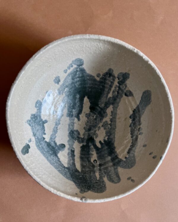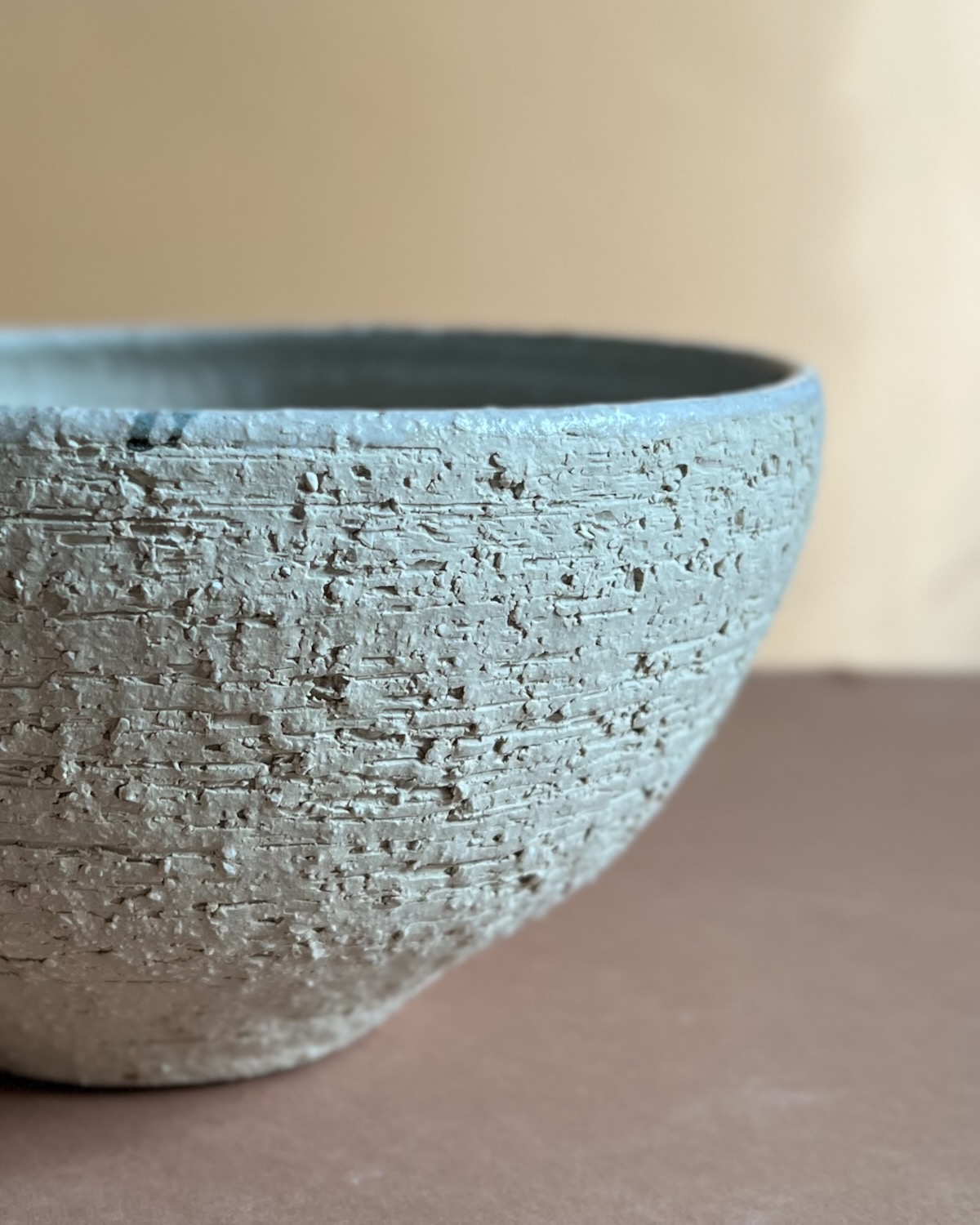 Une grande partie du saladier est en terre brute, le grain de l’argile est très présent.